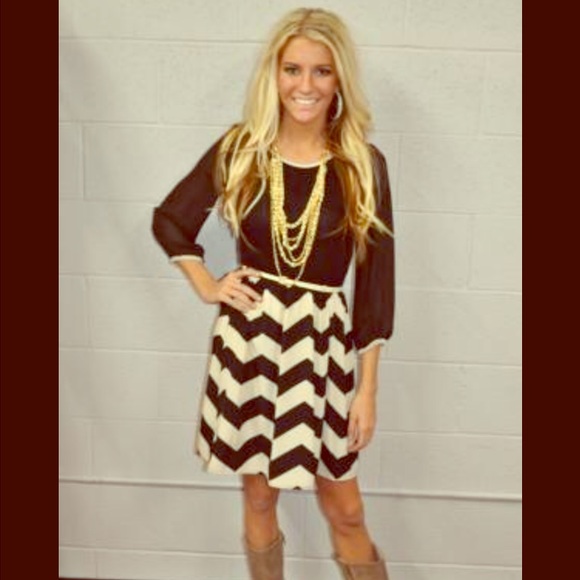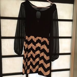 Boutique chevron dress. Sheer sleeves with keyhole back. This dress won't come with the belt as shown in the first pic. The dress for sale also doesn't have a tan trim around the sleeves and neck as shown in first pic. Great condition.