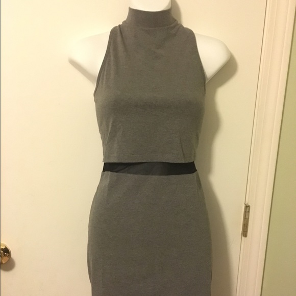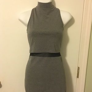 Gray dress with high collar. Mesh shown in between waist line and top portion. Dress falls to knee length