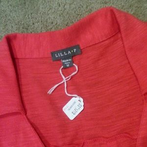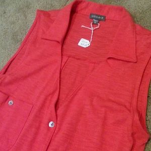Lilla <> P : Shirt dress sleeveless with low cut V and shiney mother of pearl buttons. Beautiful deep coral color in a thin cotton feel material. Can be worn as a vest or dress. Perfect for a hot day!