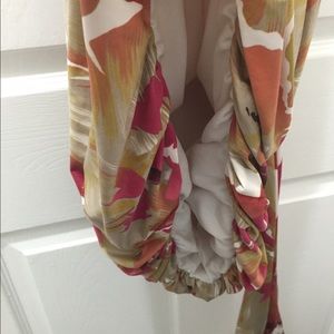 Lovely dress with painted floral print. It is stretchy and comfortable. Ties in the back. Bottom seem is elastic and creates volume.
