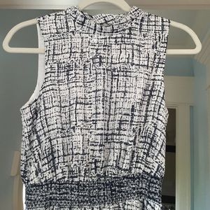 A maxi with a tight neck that comes in at the waist with a cool white and blue pattern and has a cut out back