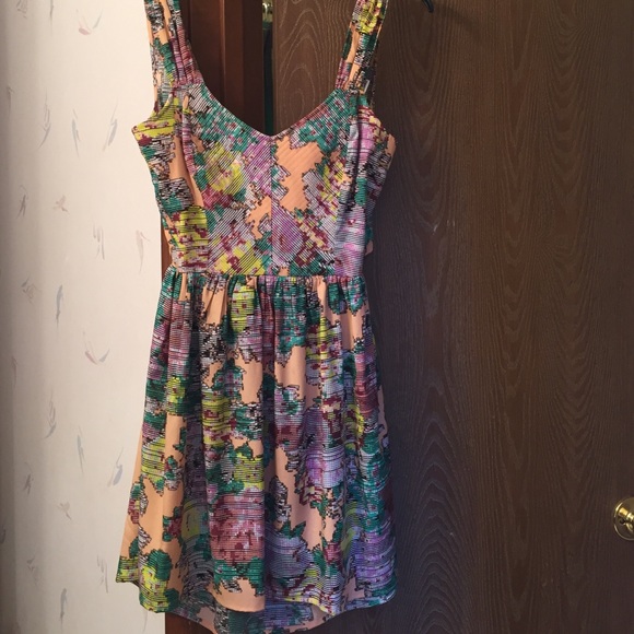 Very cute multi-color dress from Macy's. I wore this dress one time to a wedding and received many compliments! The lower back is open and there is tie to make smaller or looser around bust.