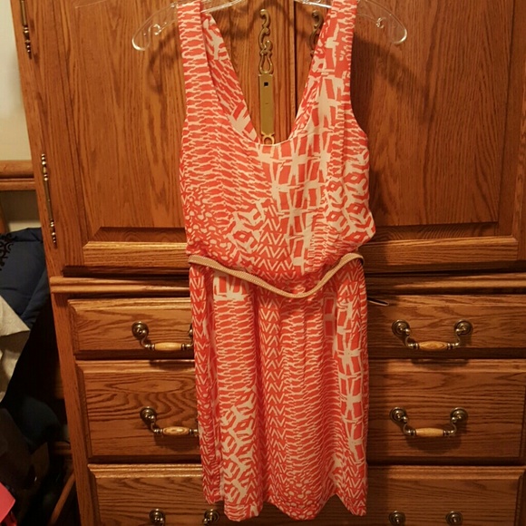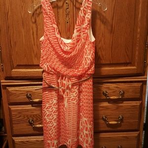 Orange and Creme sleeveless dress. Can keep belt with it or without. The back is scooped. Worn 2 times.