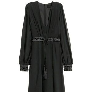 V-neck dress in double layer chiffon with long sleeves. Beaded cuffs (missing beaded belt). Please at the front, seam waist and wrap style skirt. Concealed zip at the back.
