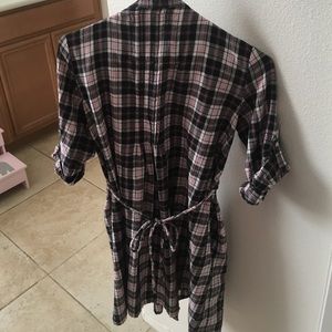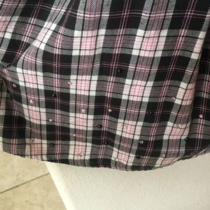 Plaid PINK dress with black and pink rhinestones at the bottom. Good condition. One button missing at the bottom of the dress. Pairs really cute with black leggings and boots