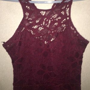 Lacy maroon dress floral pattern, flare out skirt kind of, high low ( a little ) halter straps