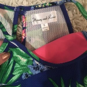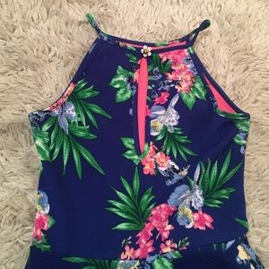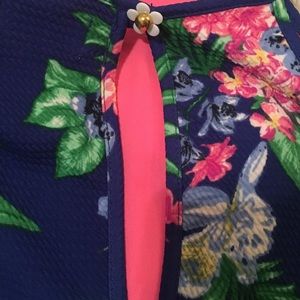 Dark blue with flowers skater dress. Has little back detailing with flower button. The inside is hot pink which adds cute detail. From Dillard's.