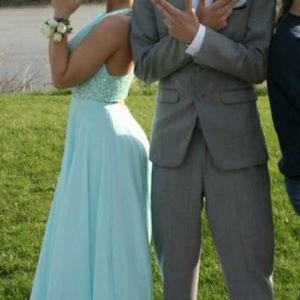 I got this for my prom, I'm selling it because I have nowhere to wear it to now. Asking $200. It was worn once. It's a light blue color I'm 5'3" and 130 lbs. The cup size would fit anywhere from a C-DDD. I absolutely love this dress but have no use for it anymore. It's about a size 4 or 6