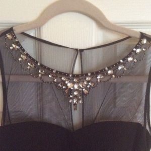 Form-fitting black dress with a gem embellishment and sheer material covering the chest. Perfect for a wedding or a party!