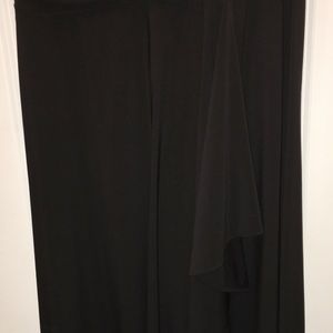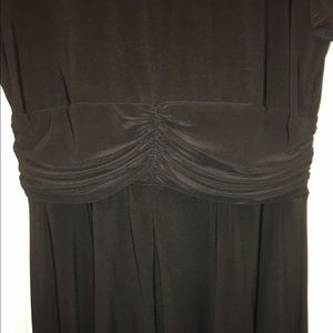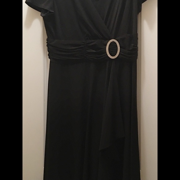 Black dress. Size 12. Slimming gathered detail at waistline. Jeweled accent at waistline. Forgiving polyester blend material.