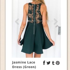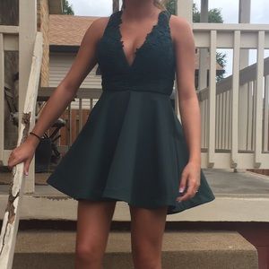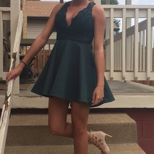 This dress is an evergreen sort of color. It was worn once for a dance. It's in great condition and has great material. Asking for 38 because I paid 50 or best offer. Any questions or more pictures needed will be no problem!