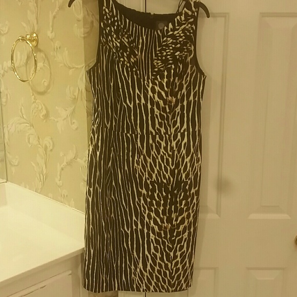 Blk, white and tan sleeveless dress. Zips up the back. Blk thin belt. Vince Camuto size 10 perfect condition