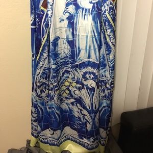 Blue and yellow flowy dress with saint