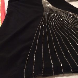 Beautiful classic black prom dress silver bead work. It starts at the neck line wrapping around the back and flowing down the front. Side zipper. Any questions welcomed.