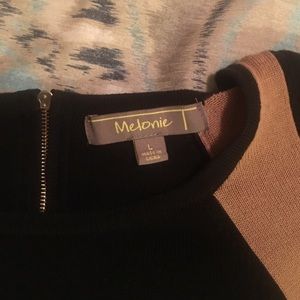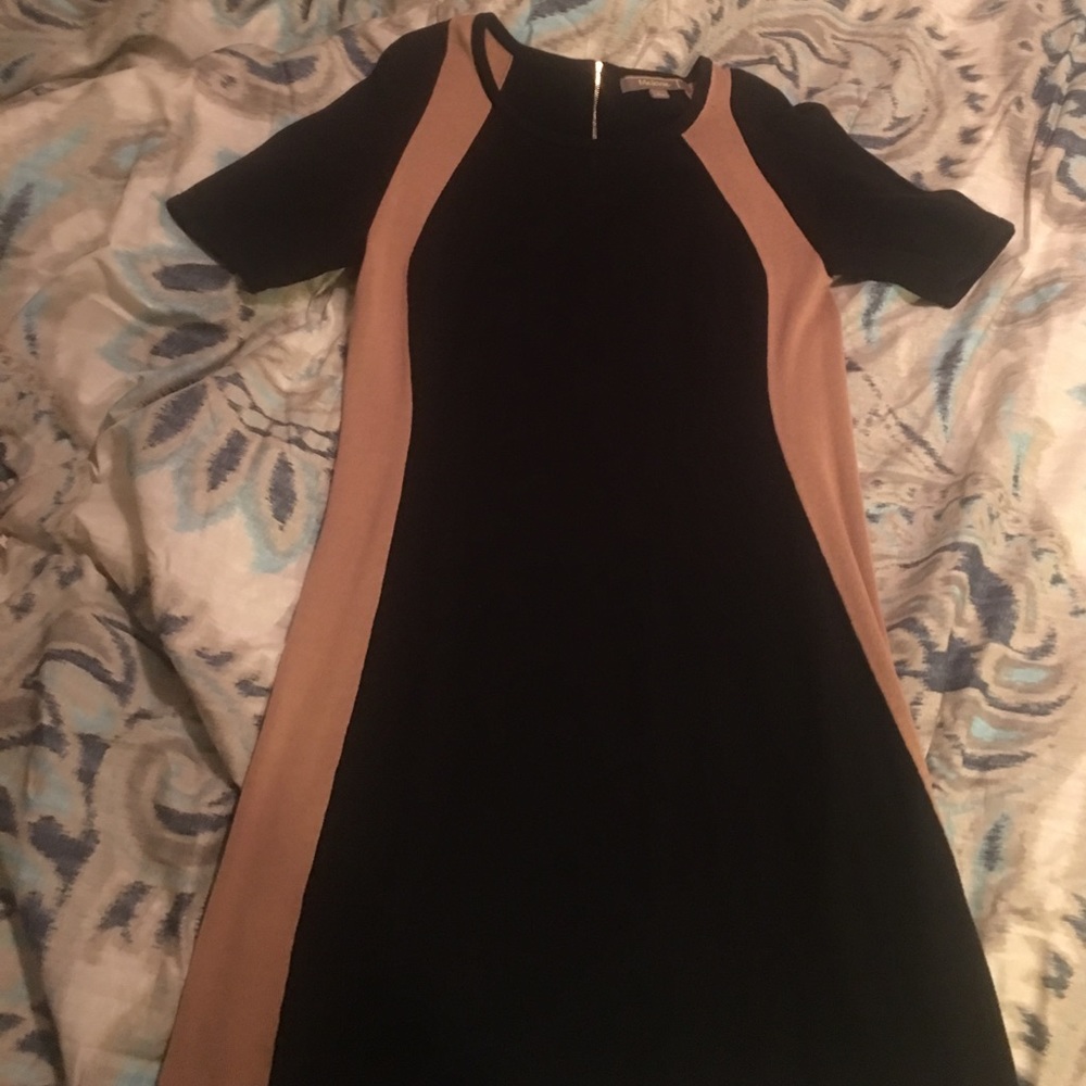Melonie short-sleeve sweater dress. Body and short sleeves black with tan accents to accentuate curves. Fitted. Shoulder to hem 36". Zipper at upper back about 8 inches.