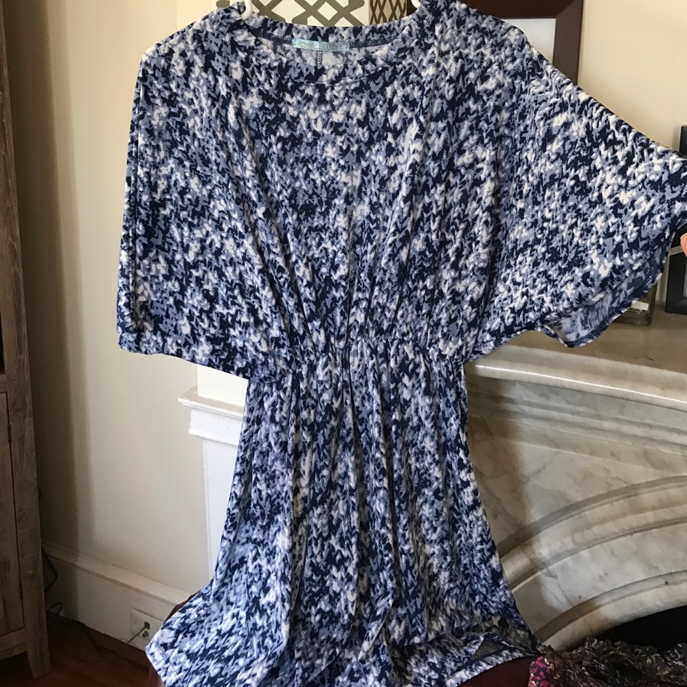This is a great lightweight spring and summer option. The navy, light blue, and white is so easy to match a cute pair of sandals with. It cinches at the waist to give a more defined waistline.