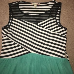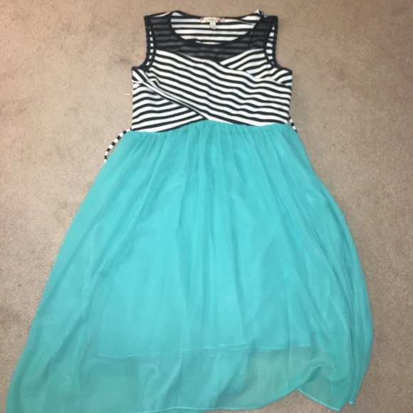 Short dress with a little mesh on top, sleeveless, and ocean blue bottom