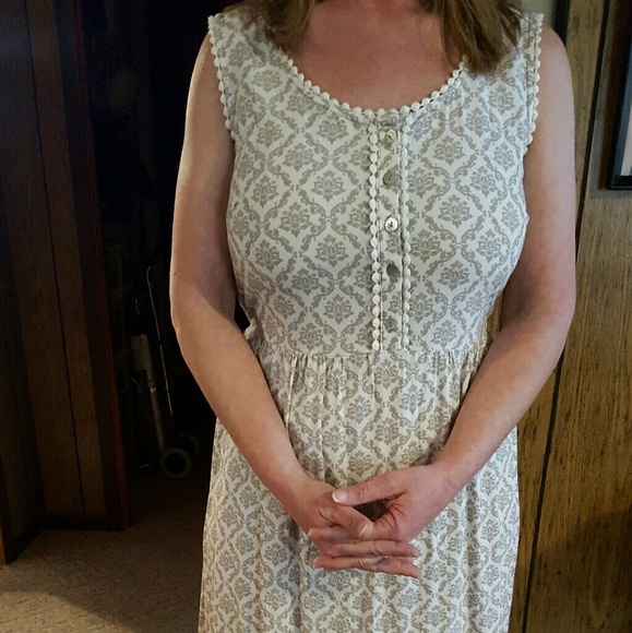 It is a tan & cram (may be considered an olive green pattern) pattern dress that is above knee length in front with long train in back. Looks great with heels I paired it with pic. Depends on your height if you want to wear flats or hrals with it. Accessorize it and dress up or be casual and still look stunning and feel comfortable. It is sleeveless but you can add a cover to it easily. NWOT only worn once to take pics with model. Excellent condition. Smoke free home.