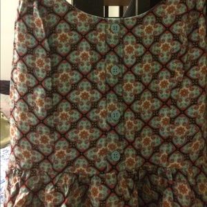 Dress with buttons down front and rouched backing makes it easier to fit multiple busy sizes bra or no bra. Super comfy. There are pockets!