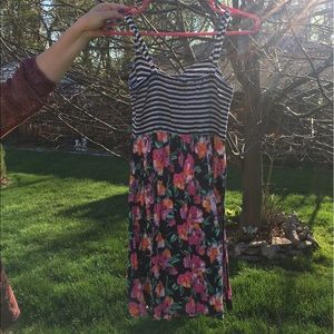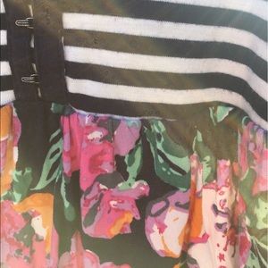 Navy and white striped top with clasps on front and navy floral bottom