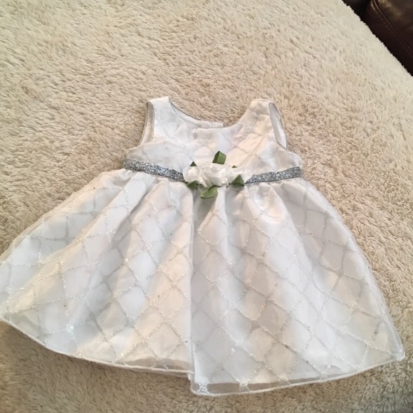 White and silver dress. Satin roses at waist. Excellent condition