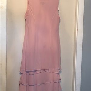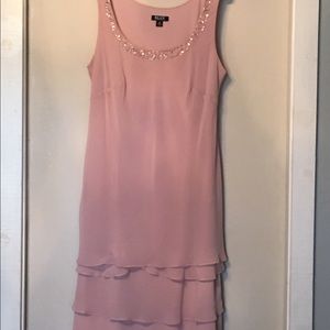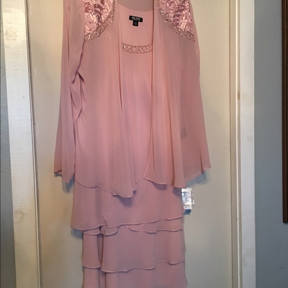 Special Occasion 2 piece dress set, tank style dress with beadwork neckline and three tier flounce on bottom of dress. Separate loose fitting jacket with bead and ribbon floral trim on sholders. Wrist length sleeves. Color: faded rose, size 14, 100 % polyester. Item is new with tags, never worn.