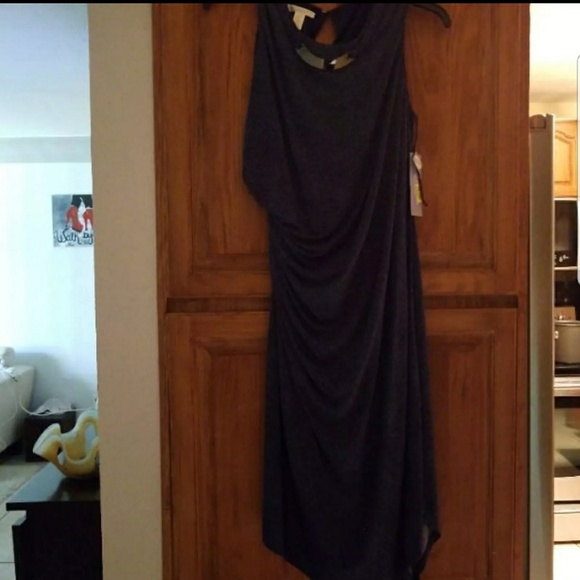 A dress with an attached accessory on the top front/gunmetal, gathered at the side to accentuate the waist, knee length, color is like a blue with specs of black.