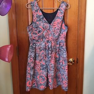 Lovely dress that cinches at the waist and flairs out, with neon pink/coral color with navy blue and white