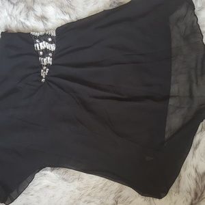 Short black dress. One sleeve. Jewel detail.