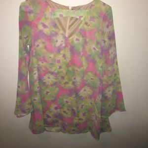 Colorful dress! Only worn once. Sheer overlay with a beige slip underneath. 100% polyester