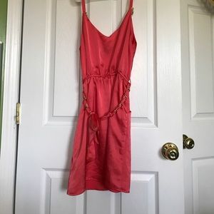 Salmon pink colored shirt with gold chains embedded on waist belt across dress and on the then straps. This is a very light dress of a satin like material that's perfect for a cute date with the humid weather. You'll stay cool and not sweat as much because the material is very thin