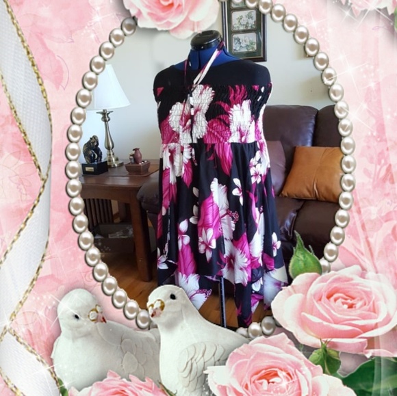 Knee length tube top Hawaiian hybiscus dress with butterfly hem. Tube top is stretchy down to the waist. The measurements laying flat are 20" across unstretched and 48" totally stretched. Length is 25" from top of tube to shortest hem point and 28" for longest hem point.