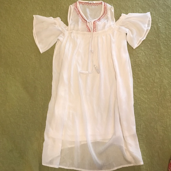 BRAND NEW White cottton/ linen soft & comfy country style, spring/summer dress (with liner) Off shoulder sleeves with front rope style tie. Great with sandals or boots. Has never been worn.