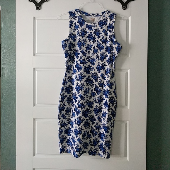 Form fitting sheath dress. Material is stretchy and lightweight. This dress has blue flowers on a white background and falls just below knee length. It's a small but I'm normally a medium and it fits me well. Only worn once, excellent condition.