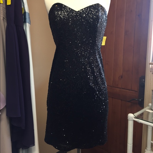 Black, short, sequin and strapless dress fit for any occasion.