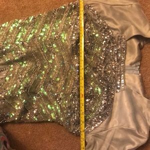 Beautiful stunning dress..I did some alterations to cover the back and front and cost $100 to do that..fits beautiful .it says size 8 but it fits like 6