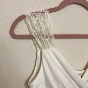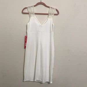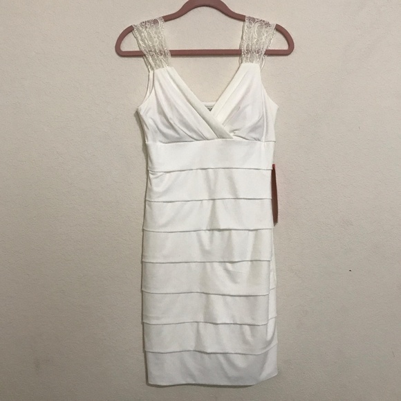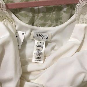 NWOT Enfocus Studio Cream Dress; 95% Polyester 5% Spandex; Contrast: 100% Nylon Lace; Lining: 100% Polyester; Machine Wash; Made in Indonesia
