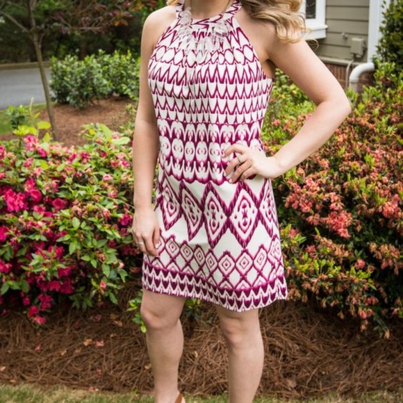 Crimson and white printed dress. High neckline with two hook/eye closures in the back. Excellent quality.