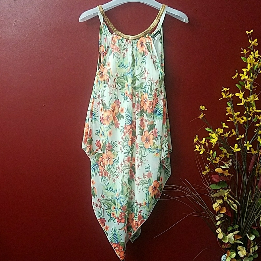 Floral orange and green, asymmetrical dress