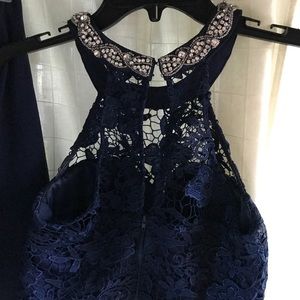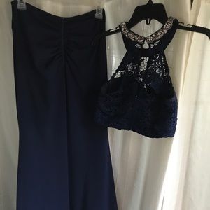 Navy blue two piece dress with silver lining on neck. Size 7. Made by my My Michelle. Worn once, great for prom!