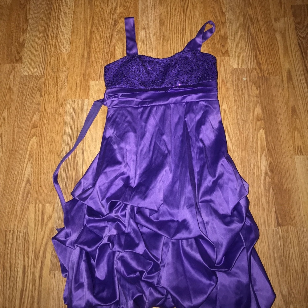 It’s a purple dress I wore it to my 8th graduation I am now a senior it’s has only been worn once it’s a beautiful dress it has a sparkle top part and it ties in the back with ruffles at the bottom of the dress