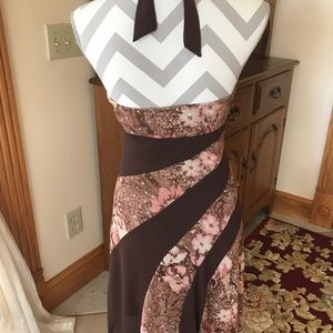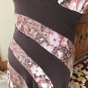 This is eye catching dress, brown and pink with sequins. Size m but it can wear like a small. Open back with asymmetrical hem line. Excellent condition!