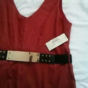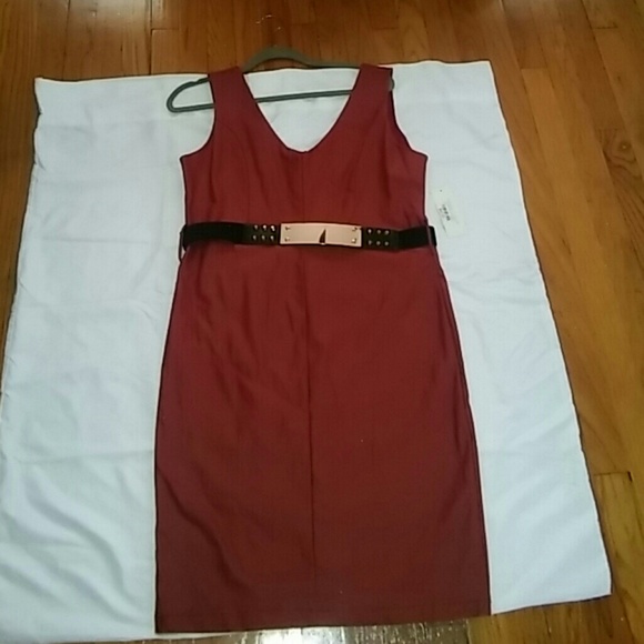 Burgundy dress with studded belt, it has a coated look so its not too shiny. Made with 3% spandex, form fitting, sits right above the knee Perfect for girls night out or date night.