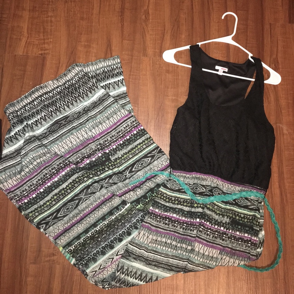 Floor length patterned dress, black lace, belt included