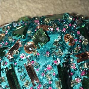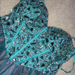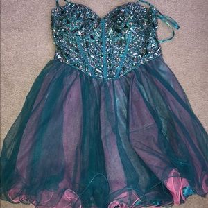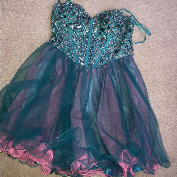 Blue and pink dress looks amazing on great for prom or even a wedding worn once has just one problem as shown in one of the pictures a Jewel is lose could easily be fixed!! Looks like cotton candy so cute. Bought from group USA Size 11/12
