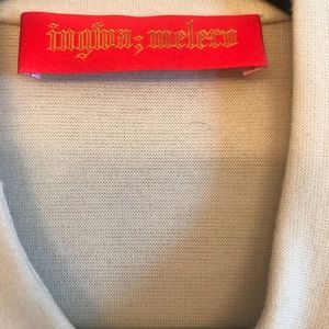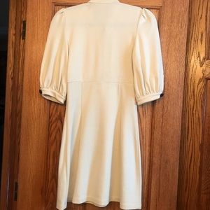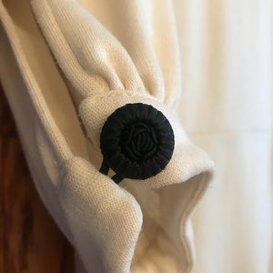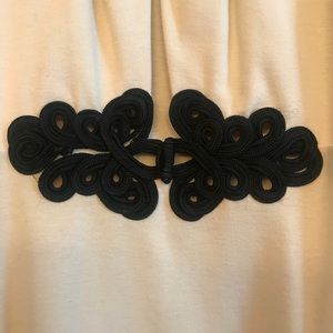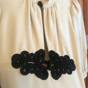 Open front dress with beautiful ornate details. The tailoring is really well done. Polyester blend feels thick like wool. Perfect for fall/winter