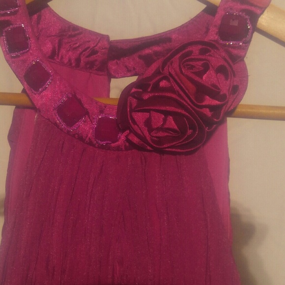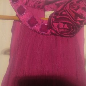 Pretty dress. Flowy- ideal for dancing or a party. Matching Material(same Material used for dress) built in to adjust how much cleavage is showing. This dress features bead work around neck. Bottons behind the neck. Ask me if intrested about measurements, as it doesn't stretch.