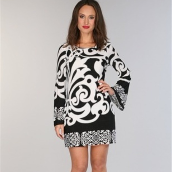 Black & White Long Sleeve Dress. Bell Sleeve and stretchable