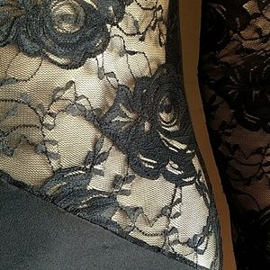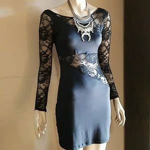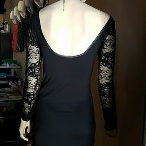 Long lace sleeves. Open U back. Sheer lace detail in middle.
