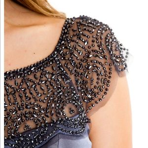 A sequined illusion neckline is a glamorous yet modest detail on this satin dress.